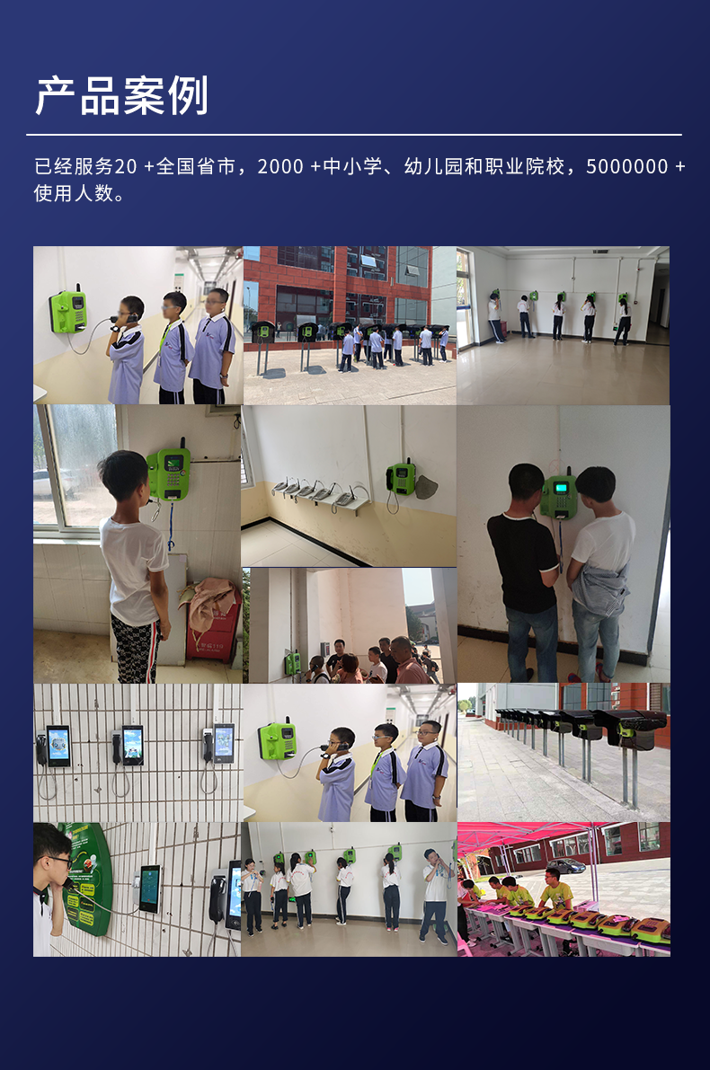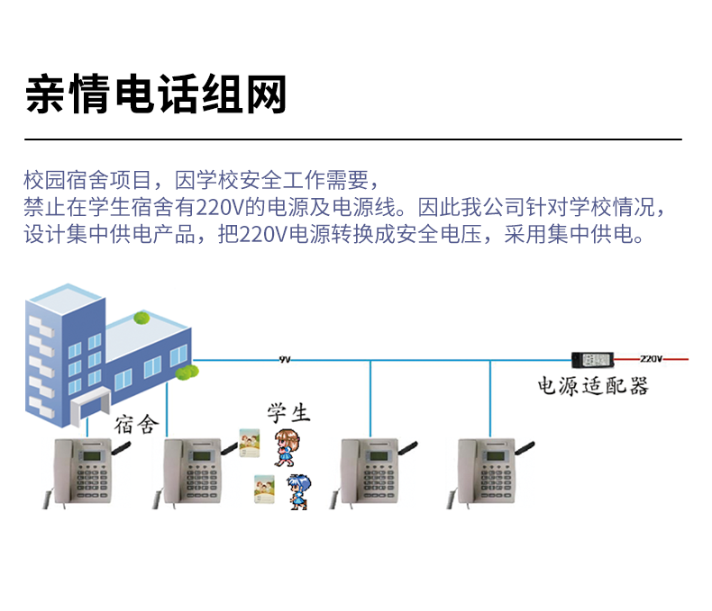 方案简介:在新的教育政策下,目前中小学学生已不能携带手机或电话手表入校园,为了满足您和孩子的沟通需求。本方案支持音频亲情电话,学生插卡即可查看亲情号码,呼叫家长的电话。方案组网(1)校园视频通话平台从校园亲情电话平台同步学校、班级、学生信息;(2)学生在学校校园亲情电话上插卡拔打亲情号码;(3)校园亲情